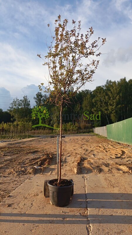 Листья овальные, распускаются бордовые, глянцевые, затем становятся красно-бурые, а к осени приобретают теплые желто-оранжевые тона. Плоды мелкие, вытянутые, равномерного темно-бордового цвета, с восковым налетом.