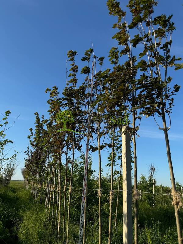 Листопадное, быстро растущее дерево, с возрастом достигающее 15 м. Форма кроны коническая, очень плотная. Листья крупные 5 лопастные. При распускании пурпурные, летом темно-зеленые, а к осени приобретает золисто-медные тона. Ствол ровный, темного цвета, с четко выраженными продольными бороздами.