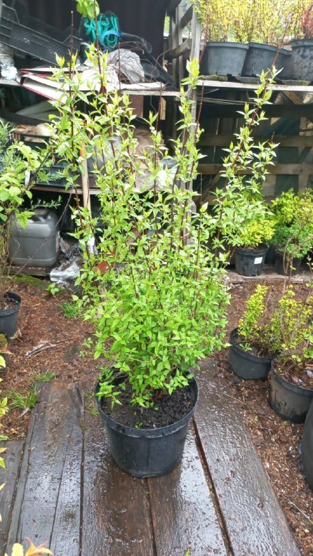 Высота 1,5-2,0 м. Крона раскидистая, пушистая, плотная, побеги изогнутые. Под тяжестью цветков побеги поникают. Листья крупные, широко-яйцевидно-ланцетные, заостренные, зеленые. Цветки простые и полумахровые, некрупные, белые, с земляничным ароматом, распускаются в июне-июле, цветет 20-25 дней. Простые цветки чашевидные с большим количеством тычинок. У полумахровых цветков лепестки нижнего круга венчика широкие, не образуют просветов, распростертые и немного отогнуты назад, внутренние - немногочисленные, завернуты внутрь. Цветение настолько обильное, что за цветками не видно листвы. Цветки собраны в короткие соцветия по 3-5 шт (макс до 9). Соцветия расположены по всей длине ветвей прошлогоднего прироста, образуя куст, цветущий от самой земли до верха.Светолюбив, но может переносить легкую тень. Обильное цветение только на освещенных местах.Предпочитает плодородные свежие, хорошо дренированные, увлажненные, супесчаные и легкосуглинистые почвы, не выносит близкого стояния грунтовых вод. Не переносит переувлажнения и засоления почвы. Довольно засухоустойчив.