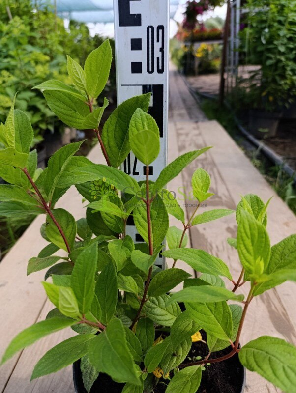 Описание сорта: Многолетний, листопадный кустарник высотой около и диаметром около 2 метров. Крона широко раскидистая, шаровидная, рыхлая, побеги крепкие при цветении неплохо держат форму. Листья крупные заостренно-яйцевидные, темно-зеленые, с четко выраженным жилкованием, шероховатые, молодые побеги пурпурные. Цветы достаточно крупные, собраны в широкопирамидальные, рыхлые, соцветия. Аромата не имеют.
