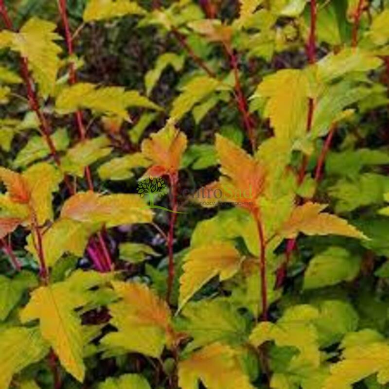 Куст плотный, высотой до 1 м, с округлой кроной. Молодые листья весной распускаются ярко-жёлтыми с красноватыми краями, летом приобретают более тёплый лимонно-зелёный фон с малиновыми прожилками и оттенками, создавая оригинальный пестролистный эффект. Цветение происходит в июне, соцветия — розовато-белые, компактные, хорошо выделяются на фоне яркой листвы. Осенью листья становятся тёпло-оранжевыми с розовым.