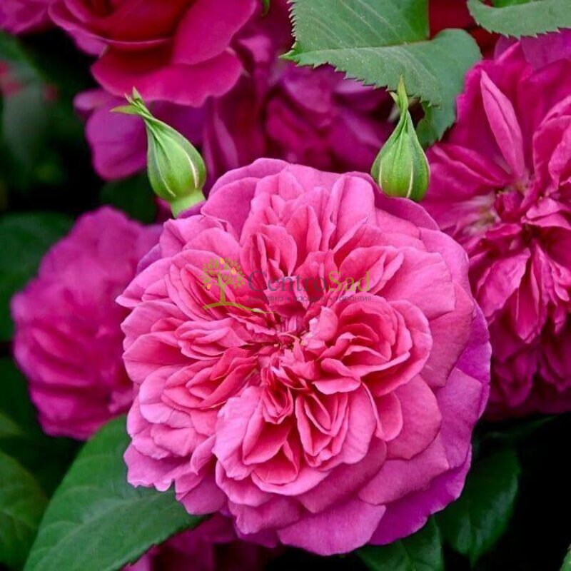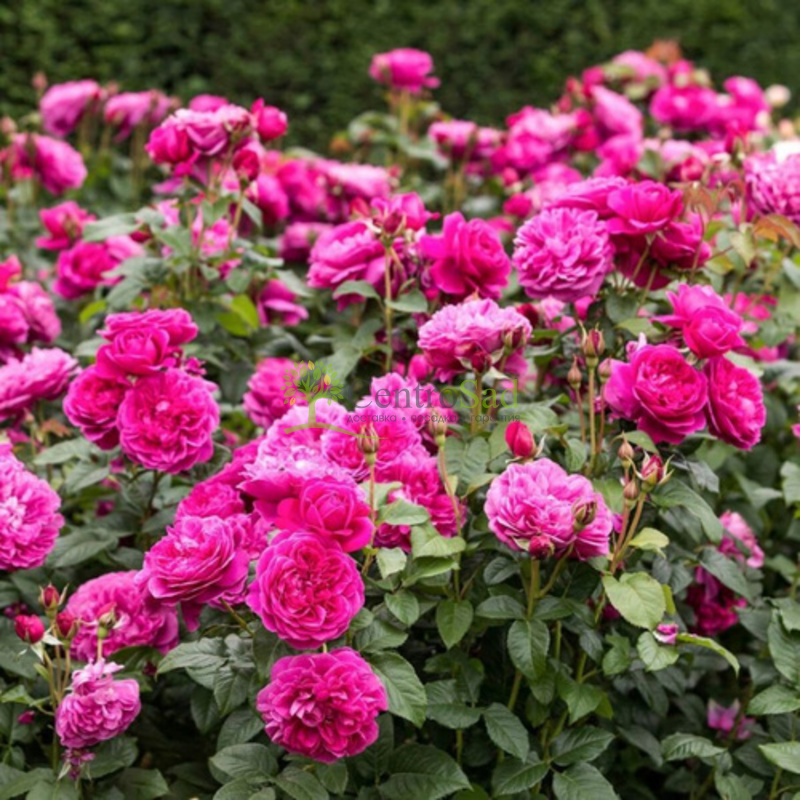Куст компактный и густой, сохраняет аккуратную форму весь сезон. Побеги крепкие, покрыты тёмно-зелёной листвой с лёгким глянцем. Цветки диаметром до 10–12 см, насыщенно-малиновые, густомахровые, распускаются медленно, плавно переходя из бутона в раскрытую розетку. Цветение продолжается волнами с июня до конца сентября. Аромат сильный, с нотками чая, ягод и старинных роз. Сорт отличается высокой устойчивостью к болезням, не выгорает на солнце, неплохо переносит дожди. Подходит для средней полосы, при укрытии зимует без повреждений.
