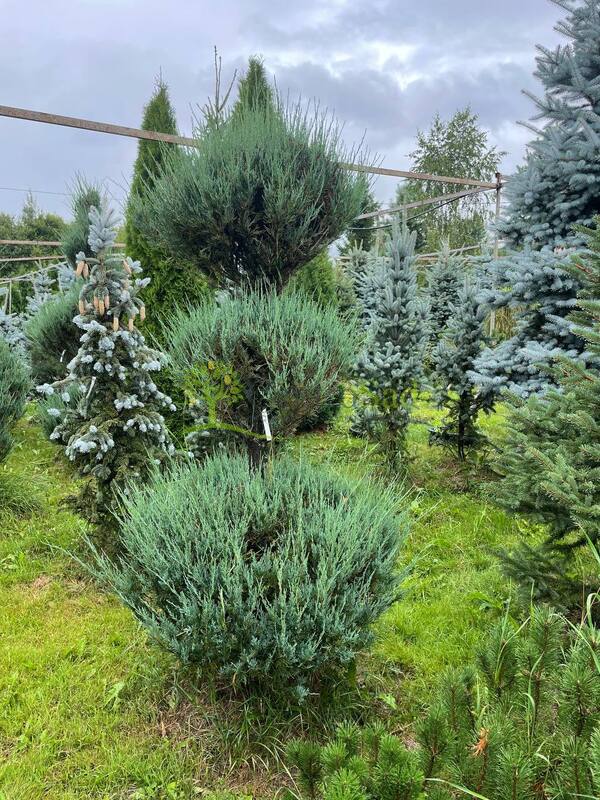 Можжевельник виргинский 'Skyrocket' (Скайрокет) в форме «Снеговик» (мультбол) — оригинальная декоративная форма с несколькими шаровидными кронами, размещёнными на одном вертикальном стволе. Визуально напоминает снежную фигуру, откуда и пошло название. Эта живая скульптура создаёт акцент в любом саду: от современного минимализма до японских или регулярных композиций. Компактность, геометричность и вечнозелёный цвет делают «Снеговик» актуальным в течение всего года.